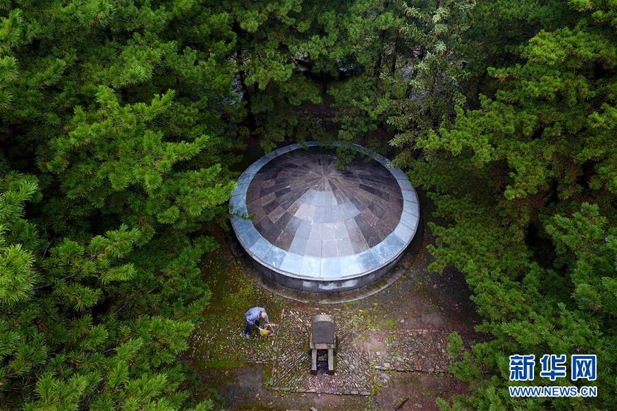 赵乃堂在黄崖洞烈士陵园内打扫(9月19日无人机拍摄)。 新华社记者 詹彦 摄
