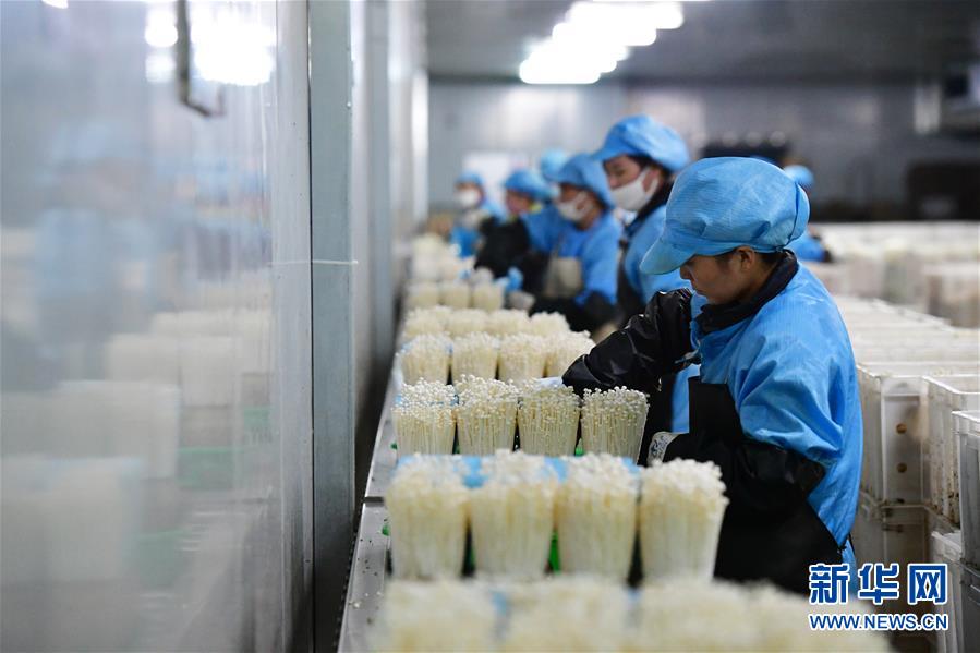 在位于清丰县的河南龙丰实业股份有限公司,工人在包装车间流水线上采摘、分拣金针菇(9月28日摄)。新华社记者冯大鹏摄