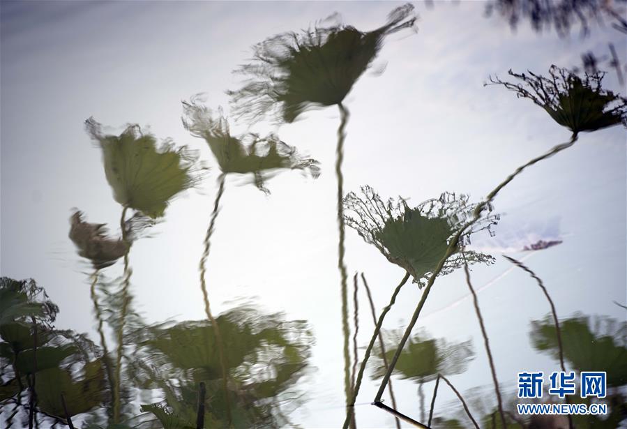 入秋以来,江苏省淮安市白马湖森林公园荷塘中的残荷与倒影相映衬,产生别样的美。 新华社发(贺敬华 摄)