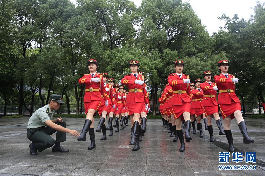 9月28日,教官为女子国旗班的成员进行正步行进指导。 新华社发(秦廷富 摄)
