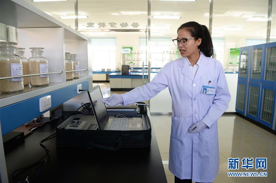 黑龙江北大荒建三江国家农业科技园区工作人员裴鑫宇在做谷物品质检测(9月27日摄)。新华社记者王凯摄