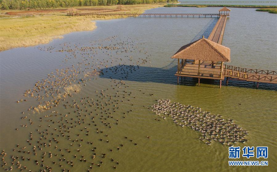 在吉林省松原市查干湖野鸭岛,成群野生水禽在水中游弋(9月27日摄)。新华社记者许畅摄