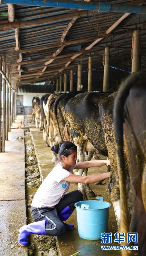 9月29日,在江西省于都县靖石乡黄沙村,一名工作人员在牛棚挤奶。新华社记者 胡晨欢 摄