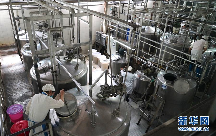 9月29日,在江西省于都县靖石乡黄沙村,工作人员在车间对牛奶进行发酵。新华社记者 胡晨欢 摄