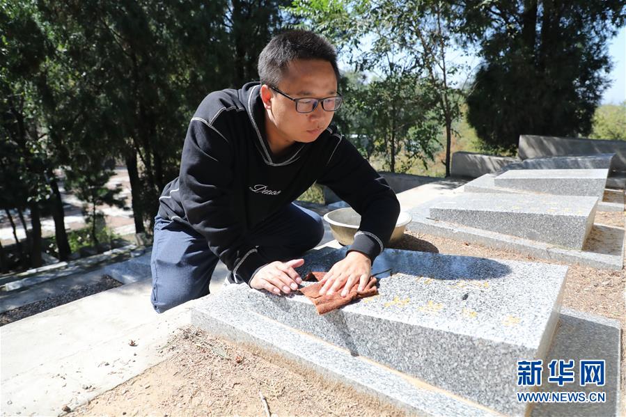 闫永杰在长城脚下的八达岭烈士陵园擦拭烈士墓碑(9月28日摄)。金秋时节,从八达岭长城脚下驱车往东,沿盘山公路行驶半个多小时,北京延庆区大榆树镇小张家口村到了。31岁的闫永杰带着记者,沿村西南一条黄土路上山,穿过荆棘丛生的杂林子,向上攀爬20多分钟,半山腰一大片草甸豁然开朗。拨开一人多高茂盛的杂草,一座新立的墓碑静静伫立在静谧的山野间,碑身上刻有“革命烈士纪念碑”几个烫金大字。碑后是紧挨着的6座土坟。延庆地处北京市西北部,是曾经的平北抗日根据地一部分,在这里牺牲的烈士众多。寻找烈士、为烈士“安家”是闫永杰4年来的一项重要工作。2014年,这个性格腼腆、个头不高的小伙子,大学毕业后回到家乡延庆,成为区民政局优抚安置科一名工作人员,负责烈士纪念设施维护等相关工作。新华社记者 王君璐 摄
