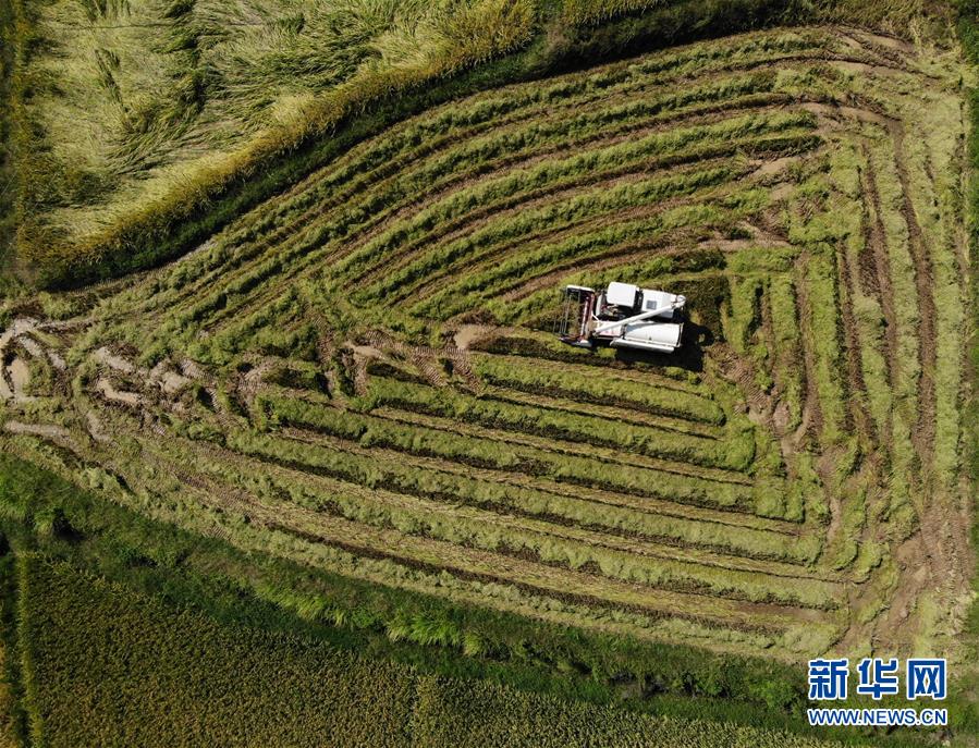 9月29日,在湖南省益阳市资阳区新桥河镇田庄湾村,龚玉姣在稻田里操作收割机收割稻谷(无人机拍摄)。眼下正是水稻成熟的时节,在湖南省益阳市资阳区新桥河镇田庄湾村,农机手龚玉姣在稻田里忙碌。2008年开始,龚玉姣一家开始承包流转土地,从最开始的20余亩到目前的2000余亩,并先后成立水稻种植专业合作社和农机服务农民专业合作社。如今,“种田大户”龚玉姣家不仅在农时为周围农户提供50余个短期增收岗位,也带动了更多农户加入到稻田承包的行列中。新华社发(李梦娇 摄)
