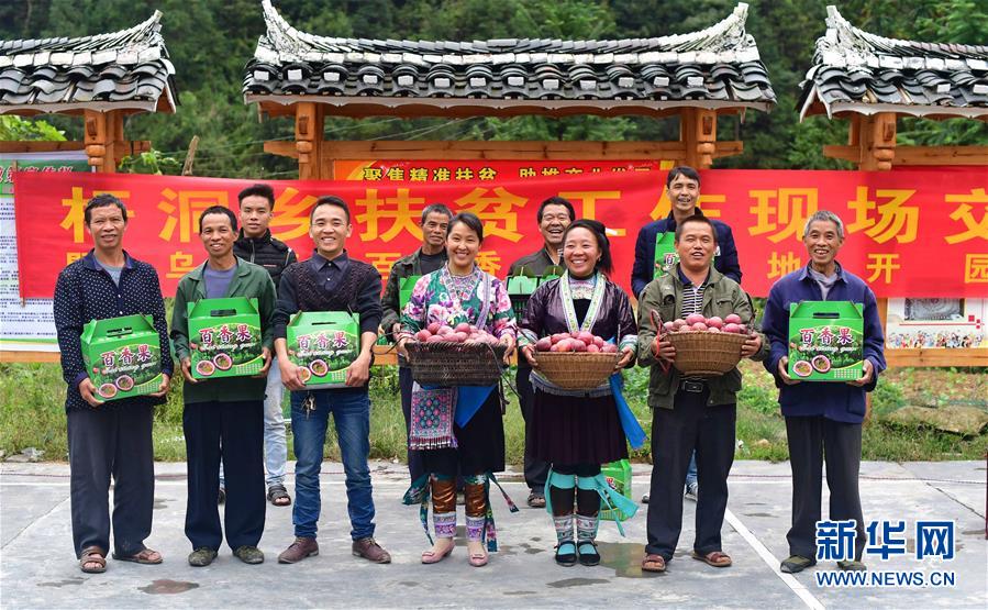 9月28日,村民在展示刚刚收获的百香果。日前,位于黔桂交界的乌英苗寨迎来了百香果收获季,党英水果种植专业合作社200多亩百香果基地的水果正陆续采摘上市。新华社记者 黄孝邦 摄
