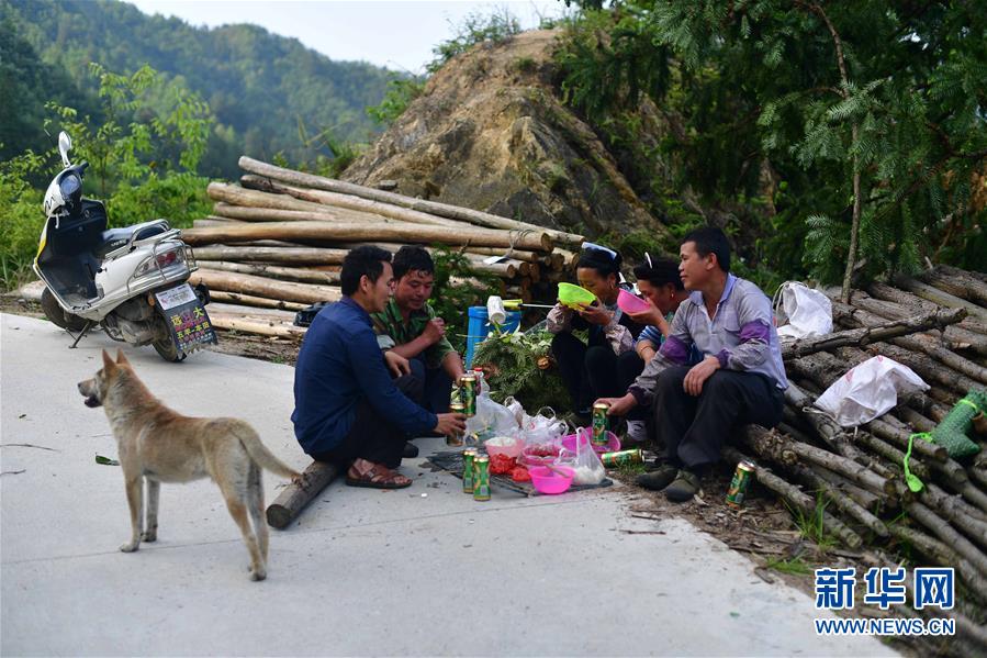 开荒种植水果的群众在吃午饭(4月30日摄)。日前,位于黔桂交界的乌英苗寨迎来了百香果收获季,党英水果种植专业合作社200多亩百香果基地的水果正陆续采摘上市。新华社记者 黄孝邦 摄
