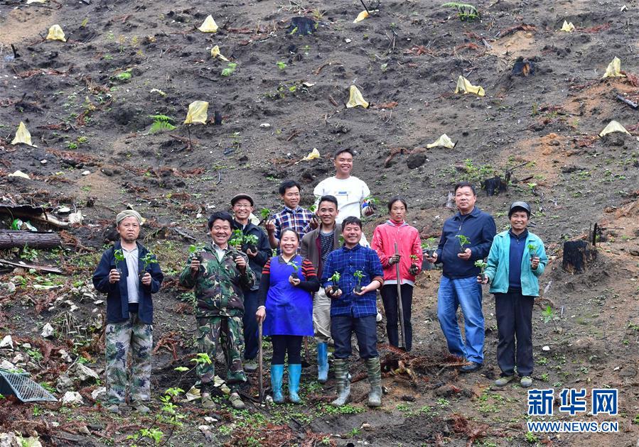 种植百香果果苗的村民和企业技术专家在一起合影留念(3月29日摄)。日前,位于黔桂交界的乌英苗寨迎来了百香果收获季,党英水果种植专业合作社200多亩百香果基地的水果正陆续采摘上市。新华社记者 黄孝邦 摄