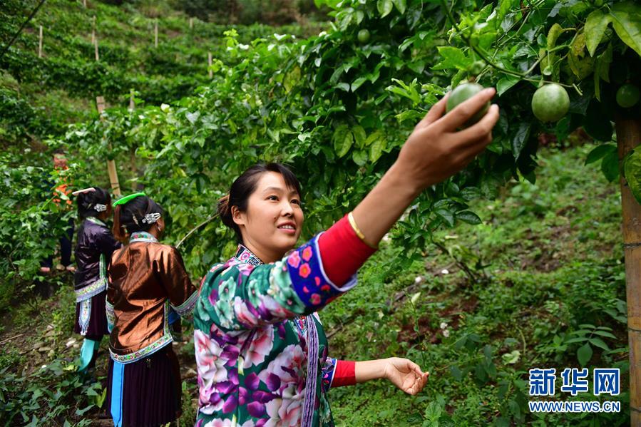 9月28日,村民在山上采摘百香果。日前,位于黔桂交界的乌英苗寨迎来了百香果收获季,党英水果种植专业合作社200多亩百香果基地的水果正陆续采摘上市。新华社记者 黄孝邦 摄