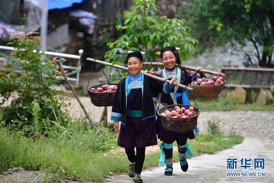 9月28日,村民挑着刚刚采摘的百香果准备卖给收购商。日前,位于黔桂交界的乌英苗寨迎来了百香果收获季,党英水果种植专业合作社200多亩百香果基地的水果正陆续采摘上市。新华社记者 黄孝邦 摄