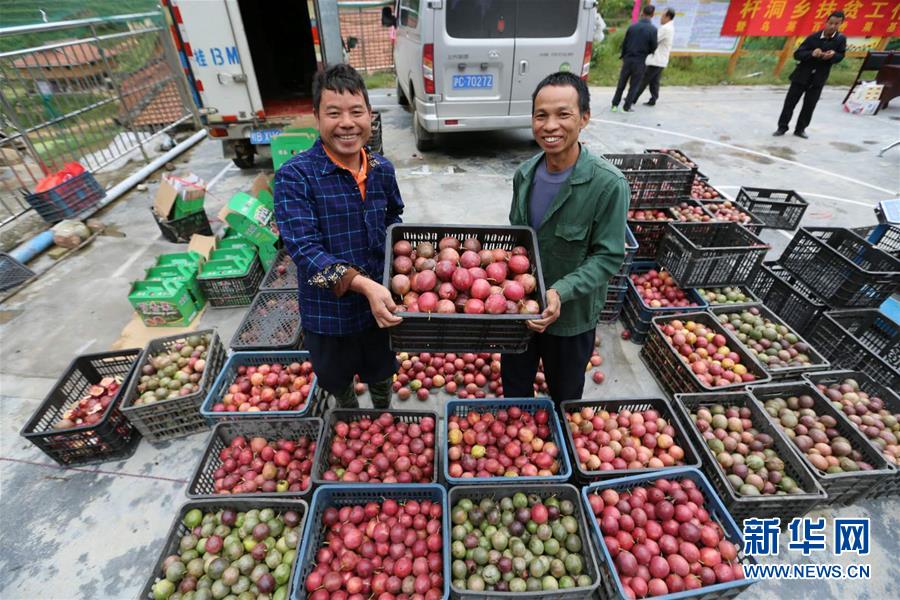 9月28日,村民在展示刚刚收获的百香果。日前,位于黔桂交界的乌英苗寨迎来了百香果收获季,党英水果种植专业合作社200多亩百香果基地的水果正陆续采摘上市。新华社记者 黄孝邦 摄