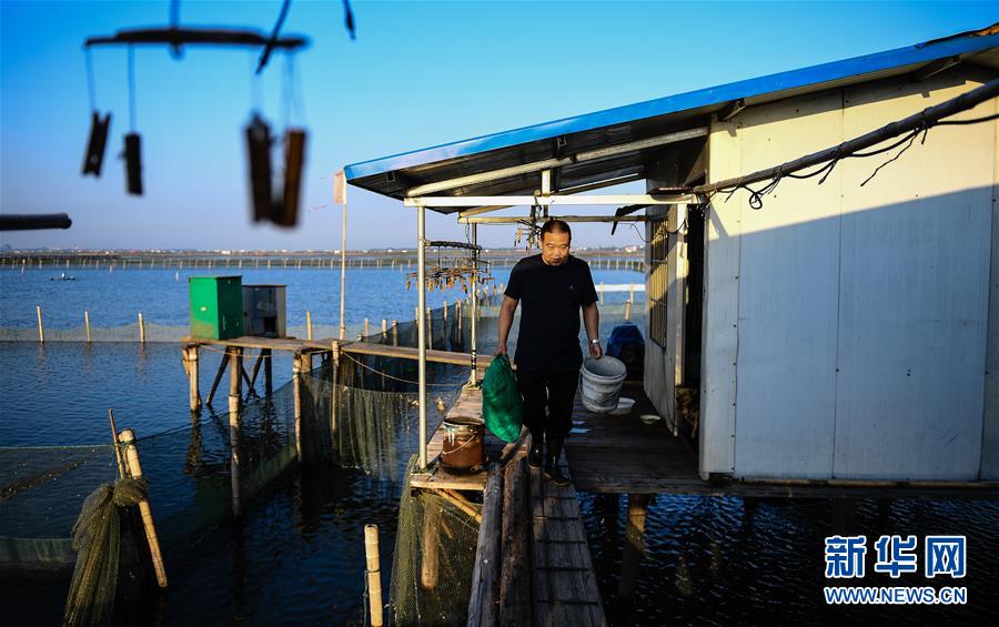 9月29日,在江苏省昆山市巴城镇阳澄湖水域,计江准备投放大闸蟹饲料。新华社记者 李响 摄