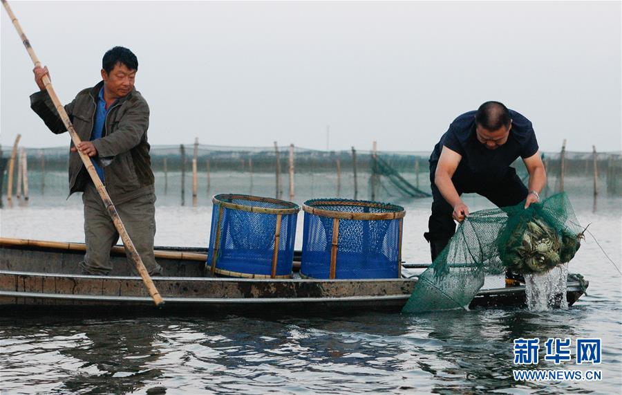 9月29日,在江苏省昆山市巴城镇阳澄湖水域,计江(右)在捕捞大闸蟹。新华社记者 朱唯希 摄