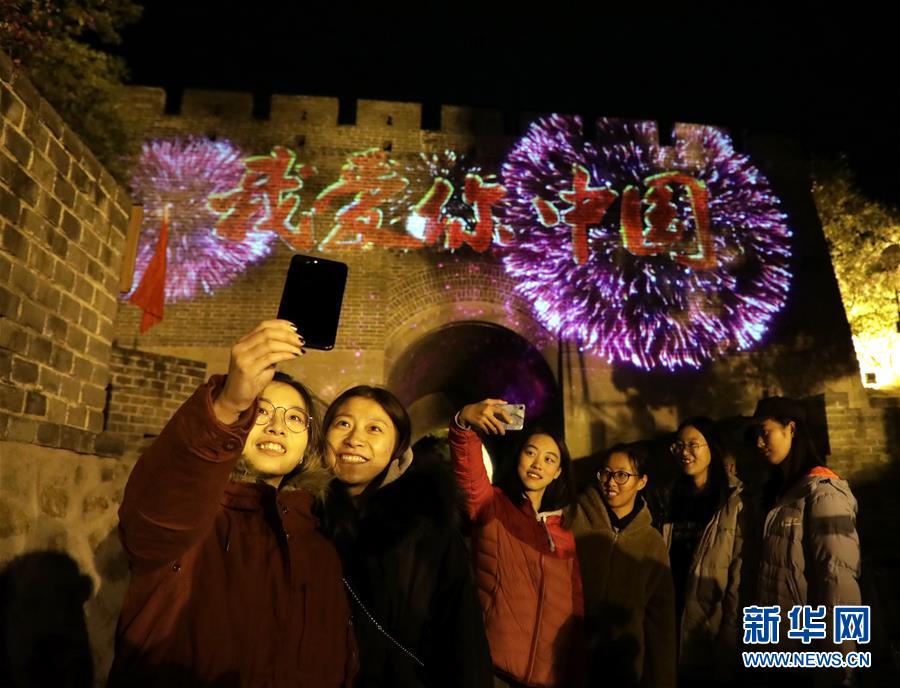 9月30日,市民在“我爱你中国”字样前合影留念。 当日,一场美轮美奂的“我爱你中国”灯光秀在北京八达岭长城上演。 新华社记者 李德欣 摄