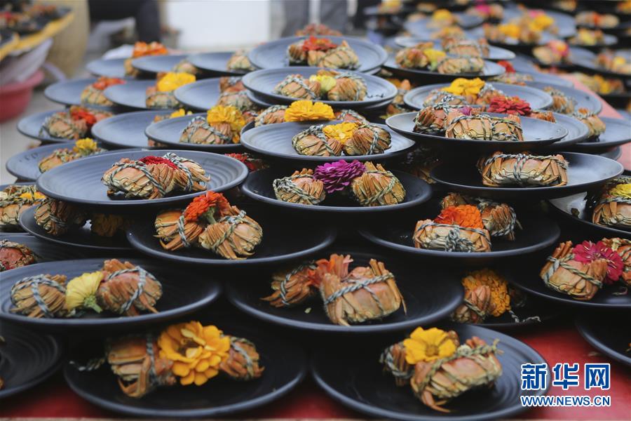 10月2日在江苏淮安洪泽区举行的“千人品螃蟹”活动上拍摄的烹饪好的螃蟹。 新华社发(万震 摄)