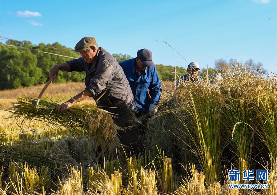 10月1日,农民在呼和浩特市土默特左旗北什轴乡恰台吉村的千亩有机水稻种植区收割水稻。 新华社记者 彭源 摄