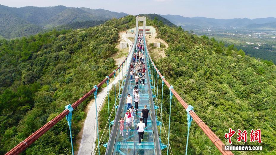10月2日,浙江省长兴县龙山玻璃栈道景区内迎来数千游客。该栈道于今年6月正式建成对外开放,全长186米,贯穿22公里龙山绿道,是浙北地区最长的玻璃索桥栈道。中新社记者 胡丰盛 摄