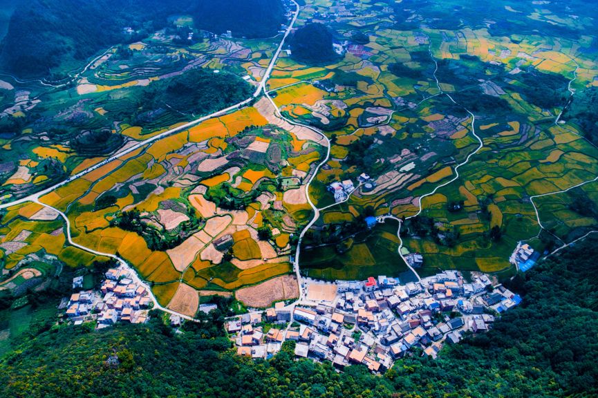 2018-09-16,广西南丹。鸟瞰金秋大地,色彩斑斓,仿若大自然的调色盘。作者:南墙