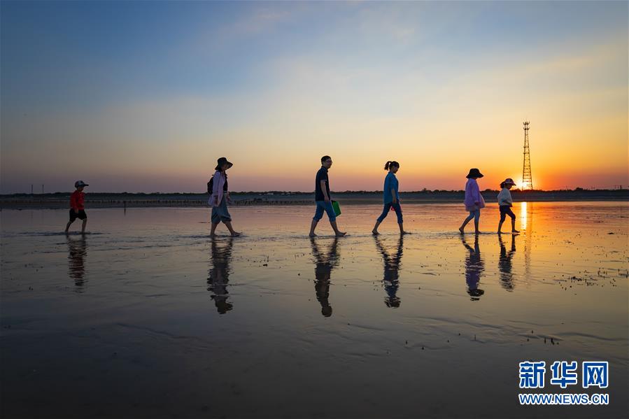 10月1日,游客在江苏省连云港市赣榆海州湾沿海赶海游玩。 新华社发(司伟 摄)