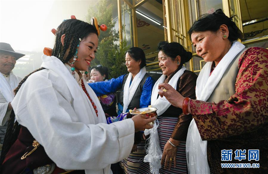 新娘斯朗卓玛(左)向亲朋敬上青稞酒以表祝福(10月3日摄)。新华社记者 刘东君 摄