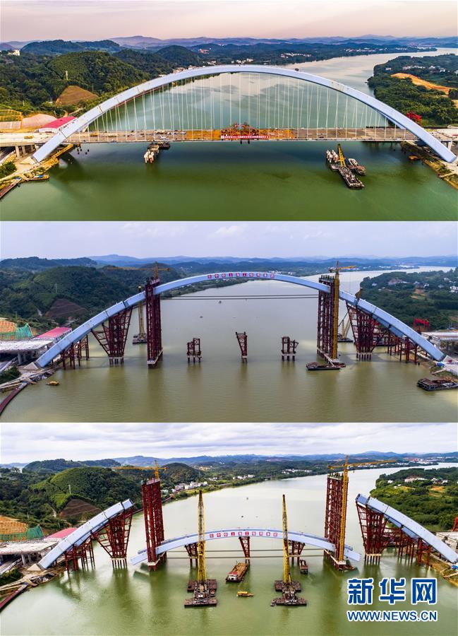 这是用无人机拍摄的广西柳州官塘大桥拼版照片:上图10月4日摄,中图5月14日摄,下图5月7日摄。