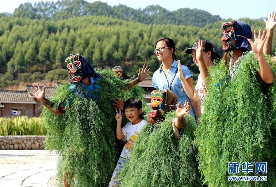 10月4日,在广西融水苗族自治县双龙沟景区,游客与装扮成“芒篙”的少数名族同胞合影。