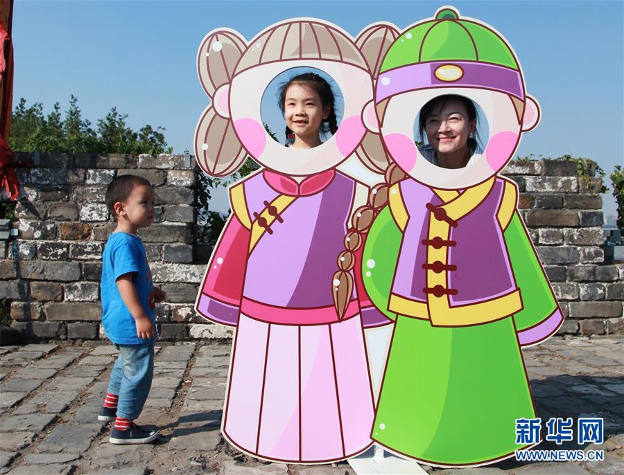 10月5日,游客在南京明城墙上快乐拍照。 新华社发(刘建华 摄)