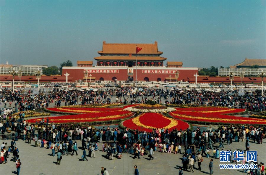 北京天安门广场的国庆花坛(翻拍照片,1986年摄)。新华社发(北京城建集团供图)