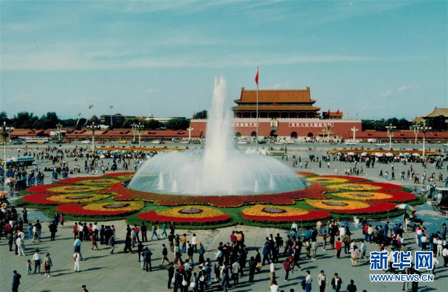 北京天安门广场的国庆花坛和喷泉(翻拍照片,1992年摄)。 新华社发(北京城建集团供图)