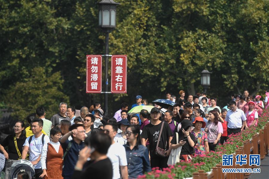 10月7日,杭州西湖风景区的断桥上游人络绎不绝。为维持秩序,景区采取了双向游客互相隔离的措施。