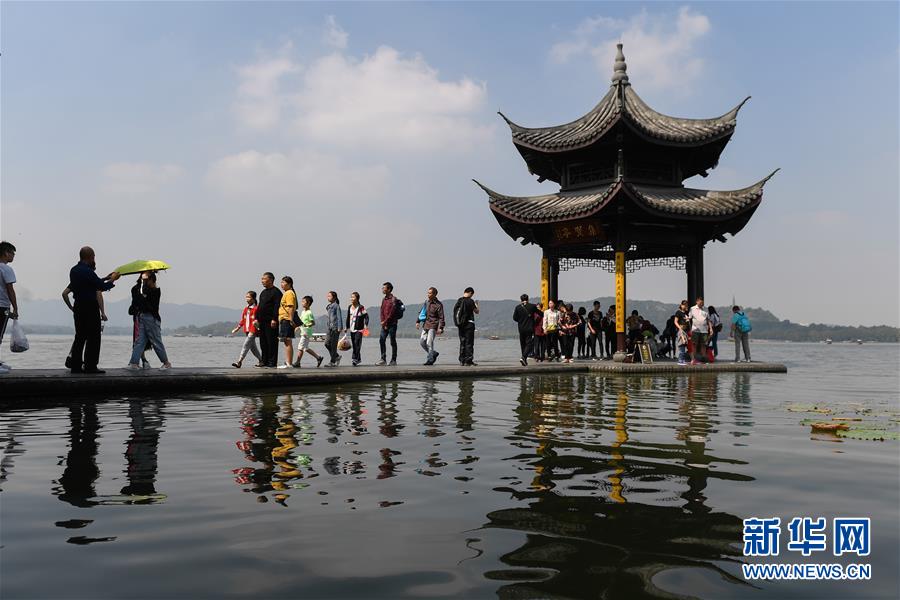 10月7日,游客在杭州西湖风景区集贤亭游览。