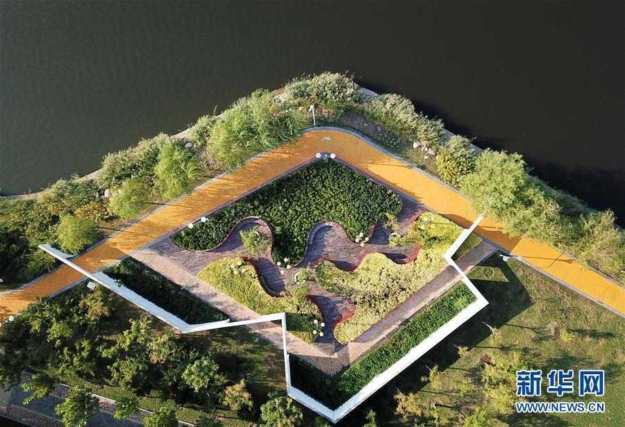 河北省黄骅市南海公园景观(10月6日无人机拍摄)。河北黄骅西湖公园和南海公园所在的位置曾经是一片城市荒地,废弃的窑厂、石料厂、煤场散落其中,带来了严重的环境问题。近年来,黄骅市对这片废弃地进行综合整治,建起两座生态公园,成为市民游客休闲游玩的好去处。新华社记者牟宇 摄