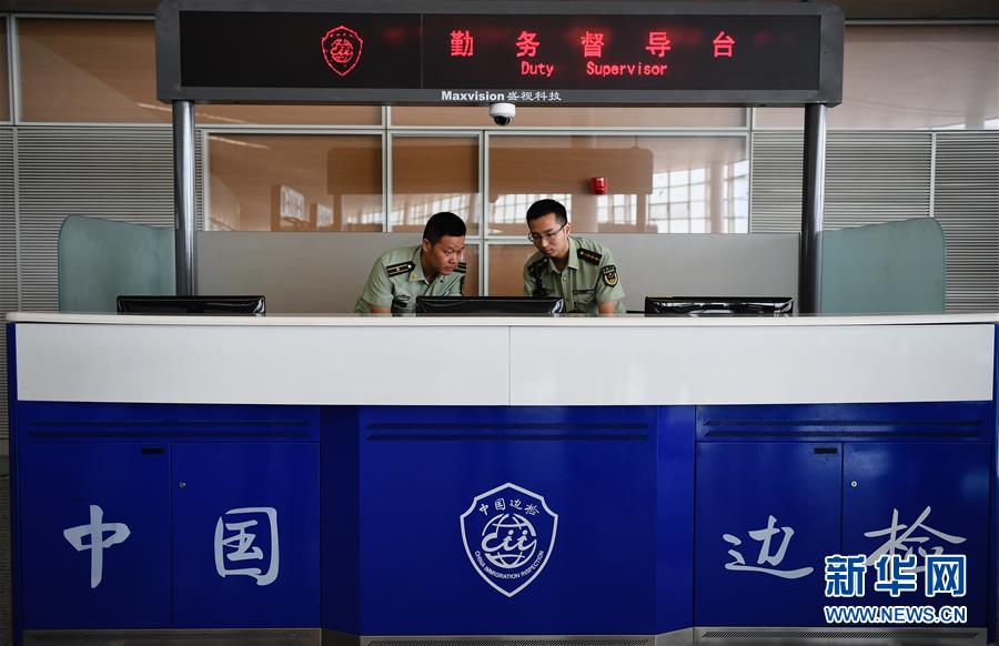 2018年8月7日,在南京禄口国际机场勤务督导台内,王志国(左)在与同事做旅客通关数据分析。 新华社记者李响摄