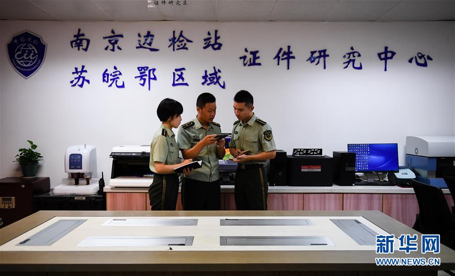 2018年8月7日,在位于南京禄口国际机场内的南京边防检查站证件研究中心,王志国(中)与同事交流证件鉴别的技巧。 新华社记者李响摄