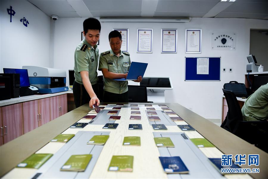 2018年8月7日,在位于南京禄口国际机场内的南京边防检查站证件研究中心,王志国(右)对各类证件样本做归档登记。 新华社记者李响摄