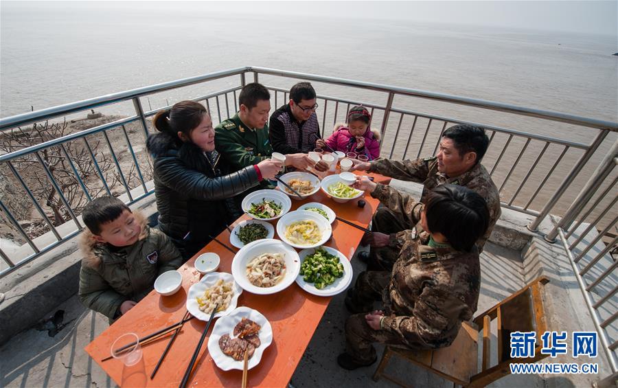 2015年2月13日,王志国(左三)和姐姐一家在开山岛上和父母团聚。 新华社记者李响摄