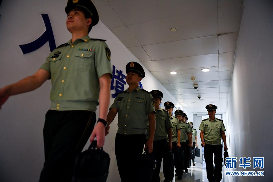 2018年8月7日,在南京禄口国际机场出境大厅,王志国(右一)带队准备开始一天的工作。 新华社记者李响摄