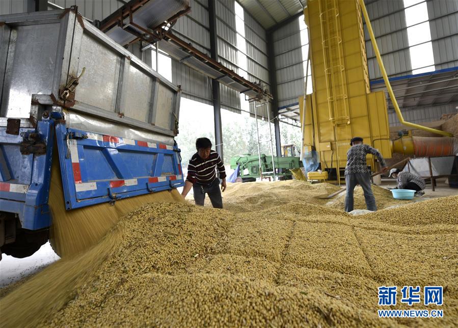 10月8日,农民在贾寨镇后寨村烘干大豆。 金秋时节,山东省聊城市茌平县贾寨镇的一家家庭农场托管种植的1200多亩大豆进入成熟收获期,工人们忙着收获、晾晒、烘干大豆。据悉,该镇的家庭农场通过土地托管的方式进行经营管理,推广农业种植新技术,带动周边村民增产、增收。 新华社发(赵玉国 摄)