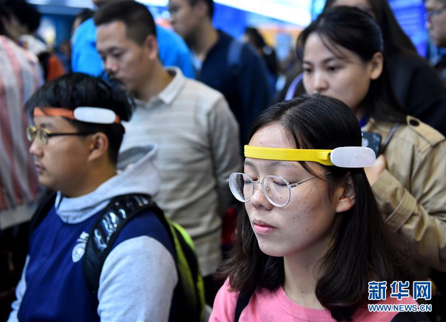 10月9日,观众在“双创周”北京会场主题展上体验一款非侵入式脑波仪。 新华社记者 罗晓光 摄