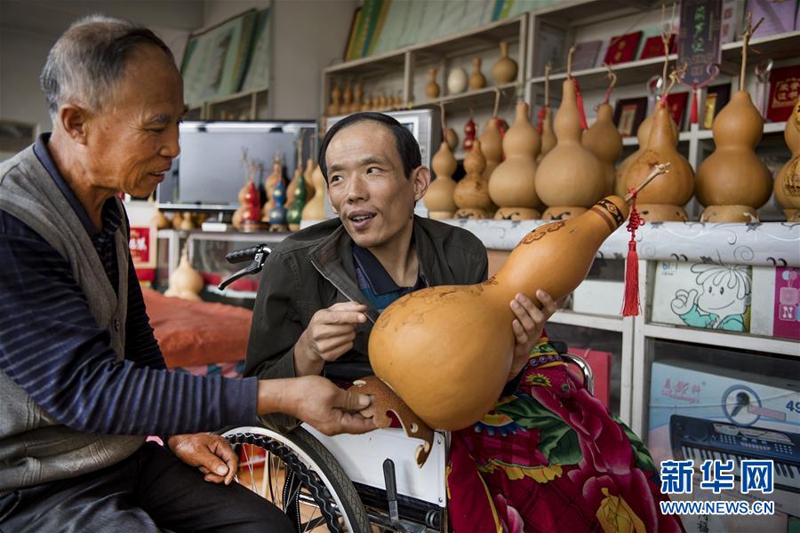 10月8日,王英杰(右)向父亲介绍葫芦烫画作品的创作想法。 新华社记者陶明摄