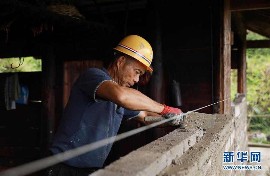 10月9日,施工人员在贵州省丹寨县排调镇排结村贫困户王学贵家中进行房屋改造施工。 新华社发(黄晓海 摄)