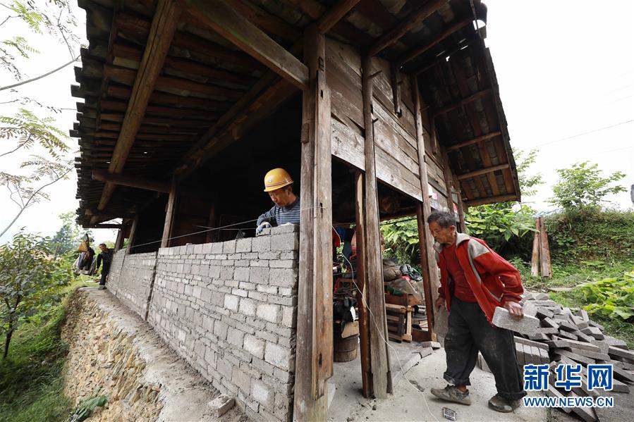 10月9日,在贵州省丹寨县排调镇排结村,贫困户王学贵(右)协助施工人员对自家房屋进行改造施工。新华社发(黄晓海 摄)