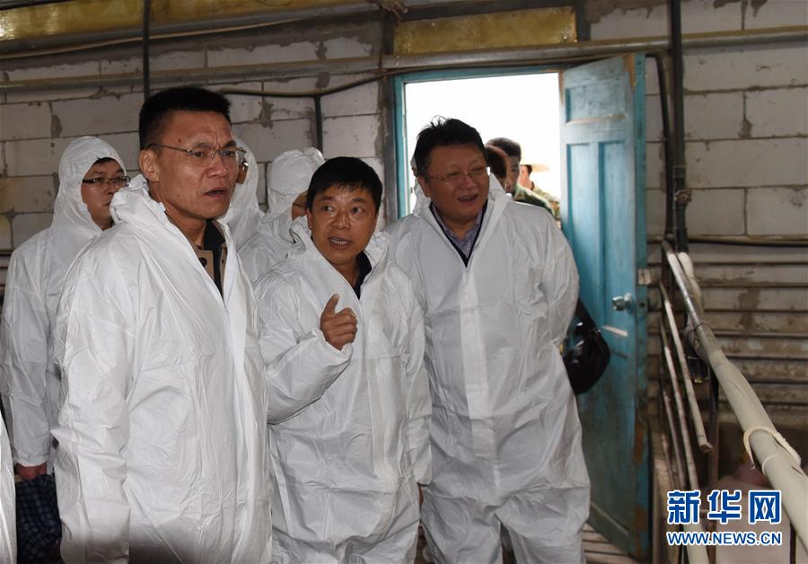 张国旺(前左一)到延平区规模养殖场调研(2017年3月10日摄)。新华社发(陈茂军 摄)