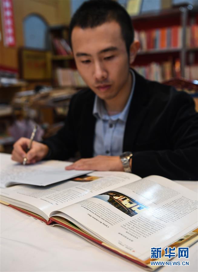 毛浩夫研读有关井冈山的英文资料,丰富自己的英文讲解素材。如果有外宾来参观,他就用英文为外宾讲解(2017年11月15日摄)。 毛浩夫是江西干部学院的一名现场教学老师,毛浩夫的爷爷毛秉华是原井冈山革命博物馆馆长,毛秉华五十年如一日地宣讲井冈山精神,被誉为“井冈山精神守望者”,1万多场宣讲会见证了他穿越半个世纪的坚守。 2018年7月,毛秉华因病去世,这让毛浩夫感觉到身上的责任更重了,他时常想起爷爷的叮咛和嘱托,在他看来,这是一种使命的传承。“爷爷一辈子都在守望井冈山精神,我要接过他的接力棒,让井冈山精神的火种生生不息。” 新华社记者 申宏摄
