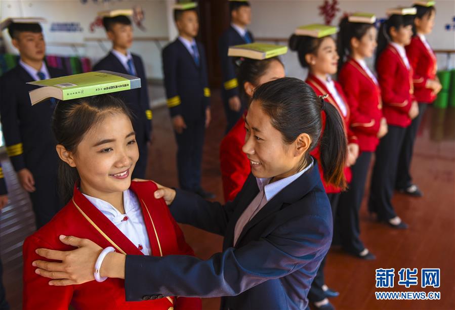 10月10日,深州市职教中心学生在教师指导下练习航空服务礼仪。 近年来,河北省深州市职教中心紧抓京津冀协同发展机遇,立足区域经济发展和市场需求前沿,采取“定向培养”模式,有针对性地培养实用型人才,改造提升传统专业,增设新能源汽车、无人机技术、航空服务、工业机器人等特色专业和实训功能室,打造新时代“工匠摇篮”。 新华社记者 李晓果 摄