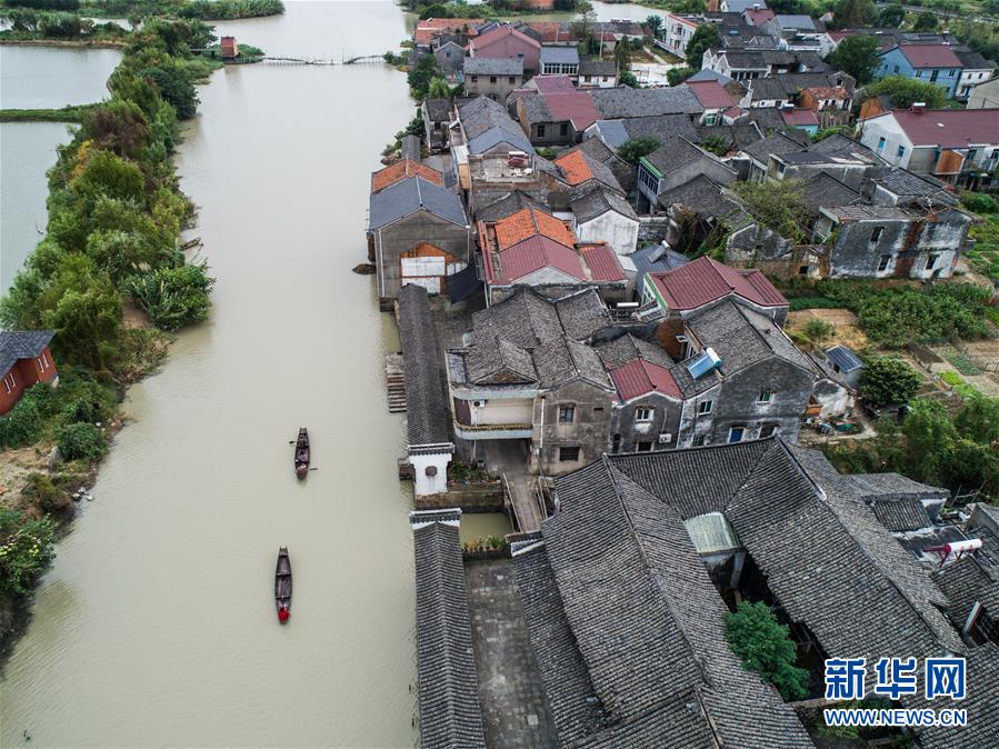 10月10日,泉家潭村村民划着小船经过沿河长廊(无人机拍摄)。经过改造提升后,沿河长廊和整洁的古村街巷成为当地美丽乡村的景观带。 新华社记者 徐昱 摄