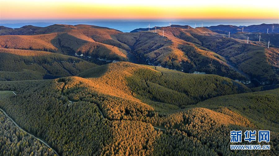 日出时分的好地方林场秋色与远处的风力发电桩(10月10日无人机拍摄)。 进入秋季,地处山西省沁源县的好地方林场变成金黄一片,四面眺望,群山环绕,绵延起伏,林海苍茫,宛如一座座金山展现在眼前。 1962年起,好地方林场职工拉开了造林的序幕,攻克落叶松山地育苗等难关,连续20年,共营造落叶松人工林29000余亩。如今的好地方林场森林总覆盖率达98%以上,成为一处“林茂草奇花艳丽”的天然氧吧。 目前沁源全县森林面积220万亩,天然牧坡120万亩,森林覆盖率达56.7%,居山西省第一,是全国天然林保护重点县、全国“油松之乡”。 新华社记者陶明摄