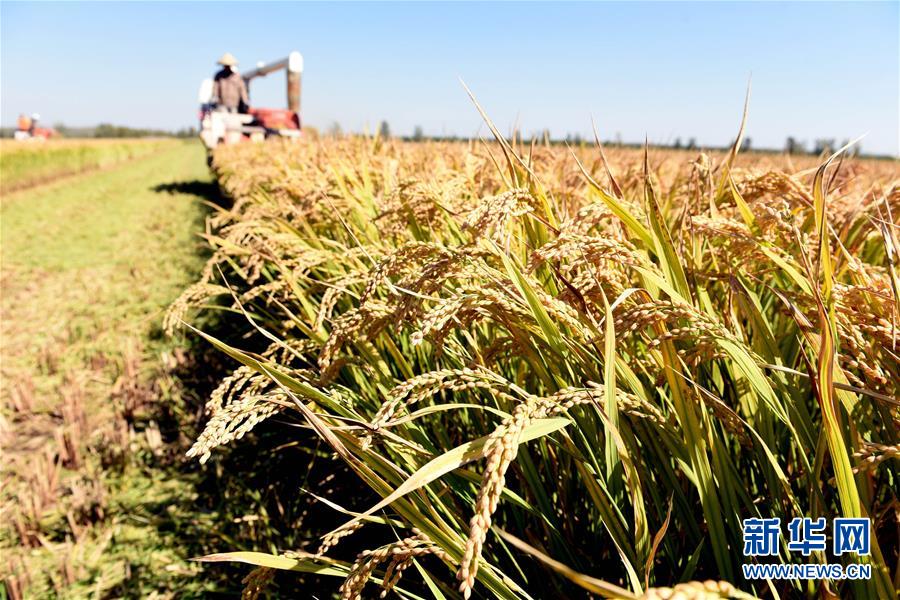 10月10日,郯城县洪伟农机化服务农民专业合作社农机手驾驶收割机收获“股份水稻”。 新华社发(房德华 摄)
