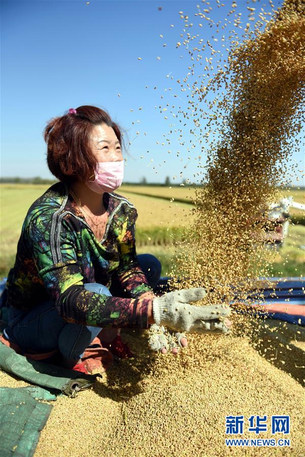 10月10日,郯城县洪伟农机化服务农民专业合作社社员在收获“股份水稻”。 新华社发(房德华 摄)